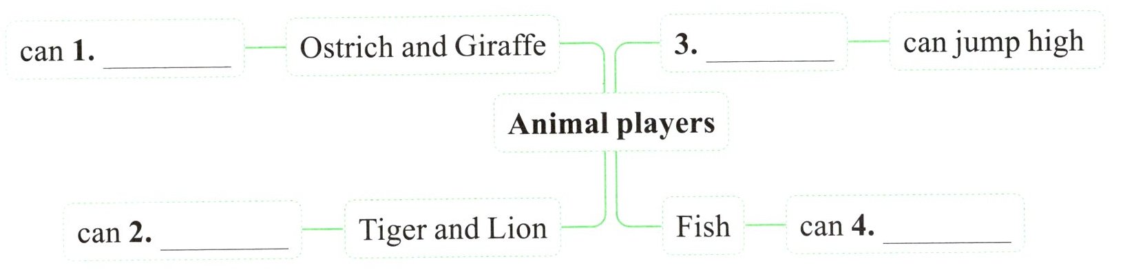 Ostrich and Giraffe can run fast. They can run across the forest. Tiger and Lion can jump far. Cat can jump high. Who’s that? He is Fish. He can swim fast.