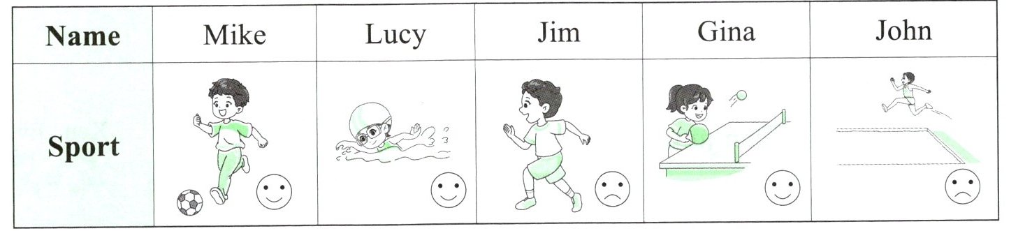 1. T 2. F 【解析】根据表格内容可知, Lucy会游泳,故本题与表格内容不相符。3. F 4. T 5. T