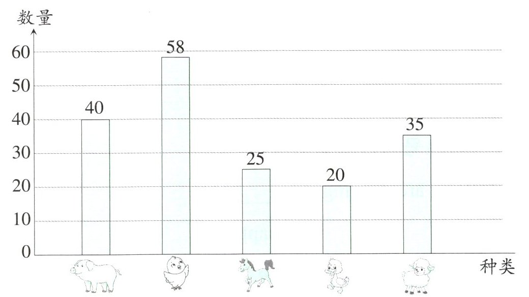 六、〔朝霞原创·新材料〕五(1)班的同学们来参观Uncle Booky的农场,他们统计了农场里动物的数量。根据统计图,用完整的句子回答问题。