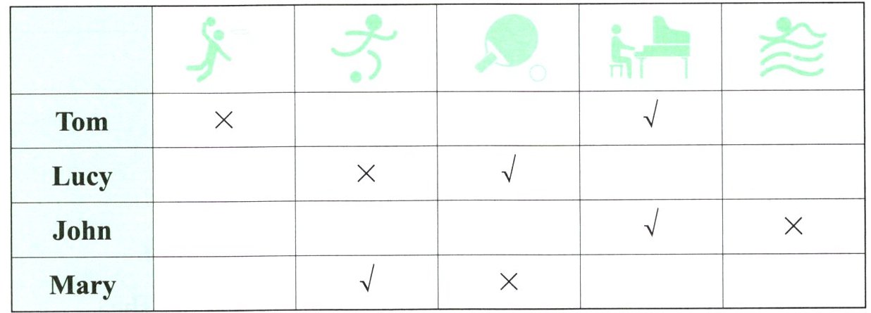 1.play table tennis, play football 2.play the piano, can't swim 3.can play football, can't play table tennis