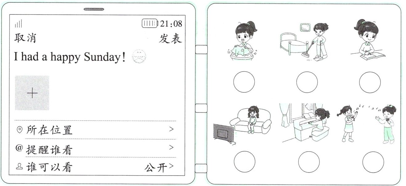 任务一:〔新题型〕根据短文内容,用“√”勾选出 Lily 上周日活动的照片,帮她完成朋友圈的配图。(6 分)