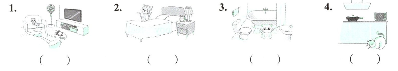 一、〔新情境〕图中的小猫分别在哪里呢?看图,选择相符的短语。