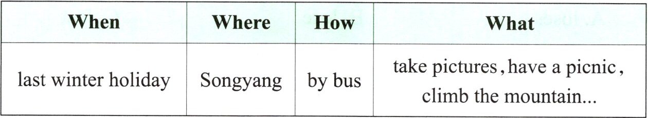 Last winter holiday, I went back to Songyang. I went there by bus. It was a nice trip. Songyang was very beautiful. I took many pictures and had a picnic with my family. I also climbed the mountain. The weather was not too cold. We had a good time on the mountain.