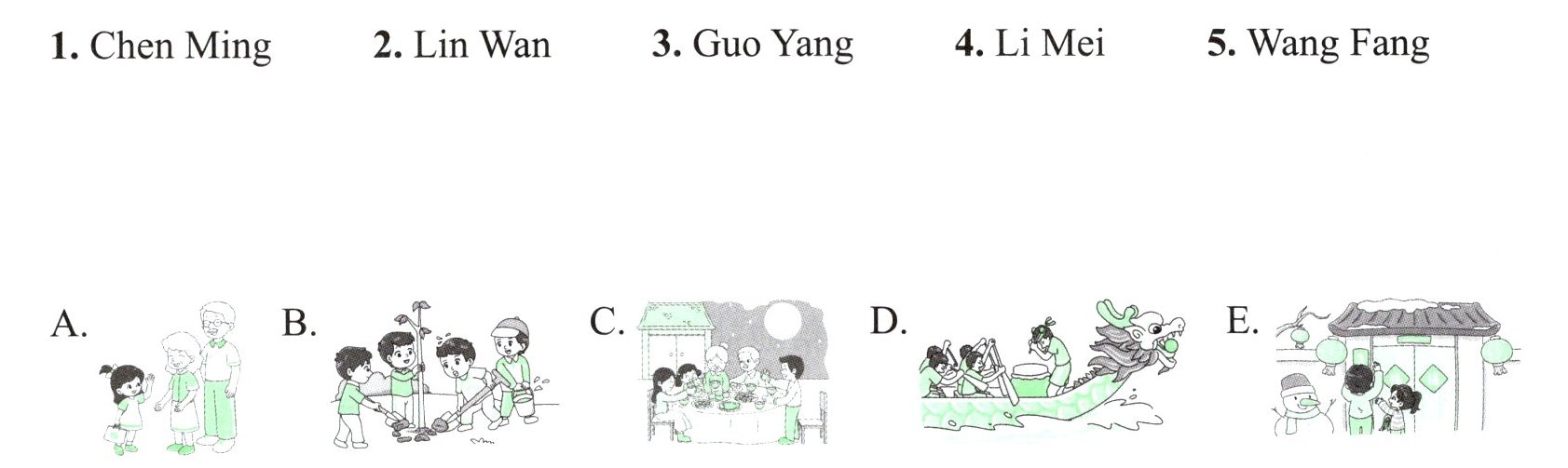 任务一:1—D 2—A 3—B 4—E 5—C 任务二:1. climbs the mountains, visits her grandfather and grandmother 2. plants trees with his friends 3. buy new clothes, get lucky money 4. sees the dragon boat race, eats zongzi