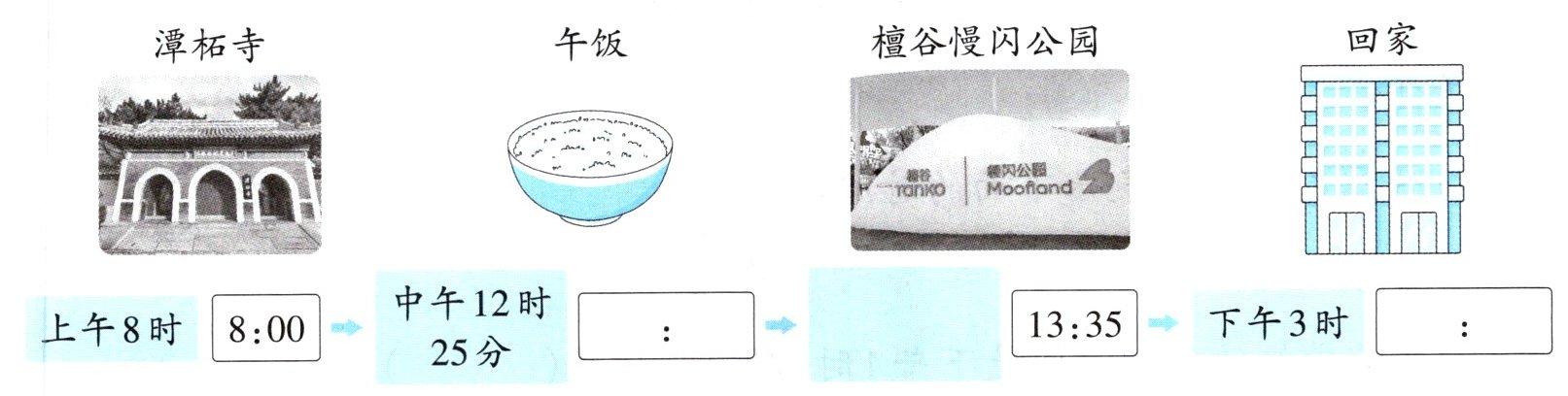 2 [北京市]周末小静一家到门头沟游玩,请你将下面的时间安排填写完整。