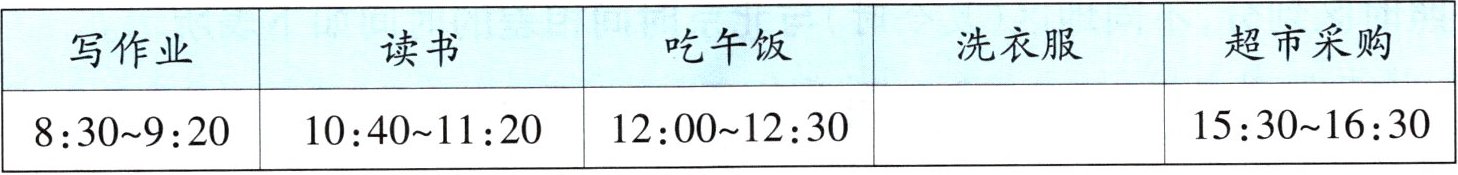 (1)小梅从 14:30 开始洗衣服,洗了 20 分钟。请你把作息时间表填完整。