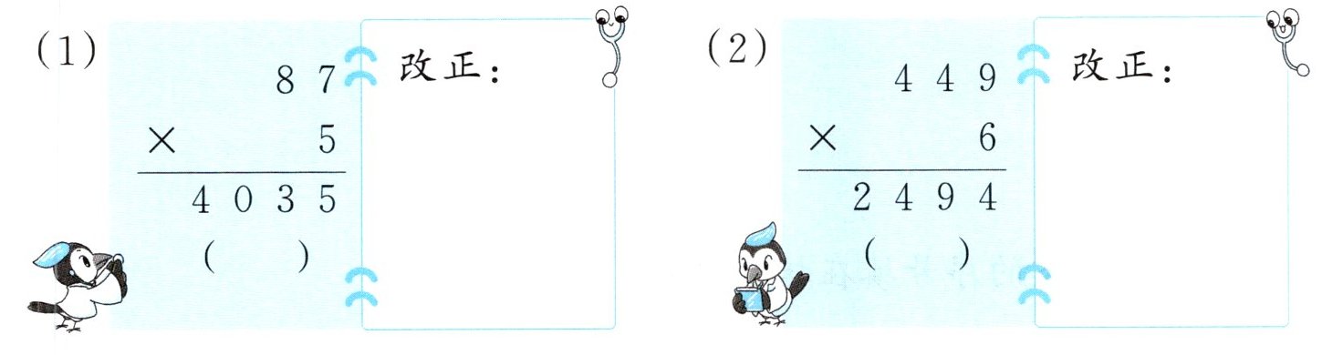 (2)个竖式中,449与6相乘时,积的百位上忘记加上进位的2,导致计算错误。