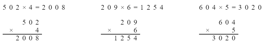 $205×9 = 18\ 45$ $408×6 = 24\ 48$ $501×4 = 20\ 04$ $207×3 = \ 6\ 21$