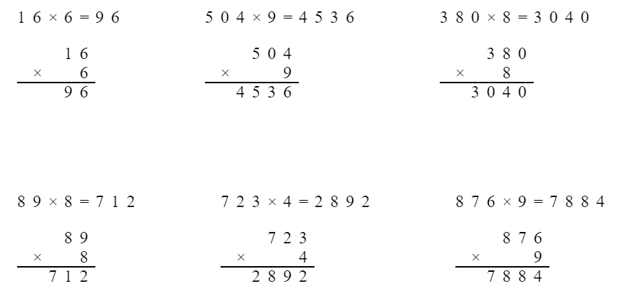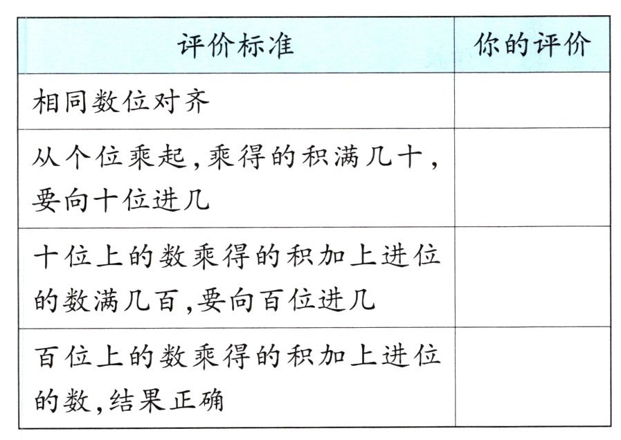 四、[新题型]请你根据三位数乘一位数笔算的评价标准对下面的竖式进行评价,并填在表中(填“正确”或“错误”)。如果竖式错误,请改正。