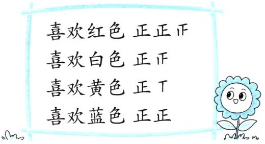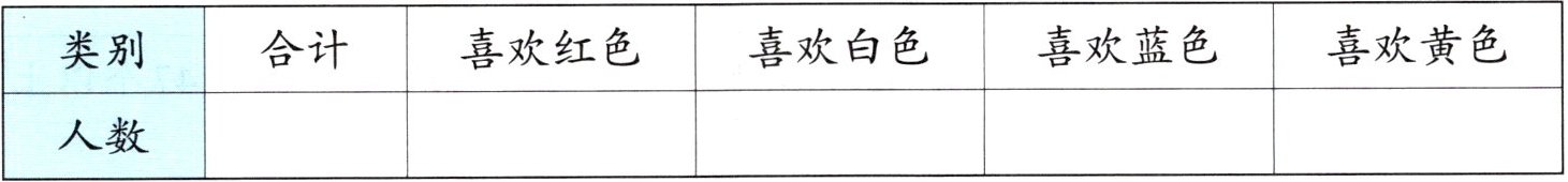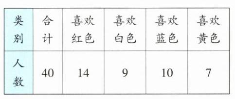 2 三年级四班需要订购合唱服,有四种颜色可供选择:红色、白色、蓝色、黄色。王老师对班里的学生进行调查,结果如右图所示。(每人只选一种)