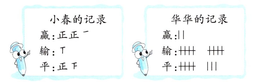 【解析】两人一共玩了20次游戏,所以每人的记录中赢、输、平的次数加起来应该都是20,并且两人平的次数应该相等,其中一个人赢的次数应该与另一个人输的次数相等。小春的记录中赢、输、平的次数加起来等于21,所以小春的记录出错了;华华的记录中赢、输、平的次数加起来等于20,是对的。华华输了10次,所以小春赢了10次,据此改正即可。