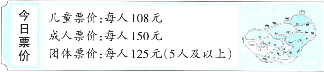 (2)5张成人票,1张儿童票:150×5+108=858(元) 6张团体票:125×6=750(元) 5张团体票,1张儿童票:125×5+108=733(元) 858>750>733 买5张团体票,1张儿童票最合算。 答:买5张团体票,1张儿童票最合算,需要花733元。
