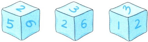 4. [思维拓展]一个正方体沙包的六个面上分别标有数字1、2、3、4、5、6,从三个不同方向可以观察到不同面上标的数字,示意图如下。想一想,标有1、2、3的面相对的面上的数字分别是多少?