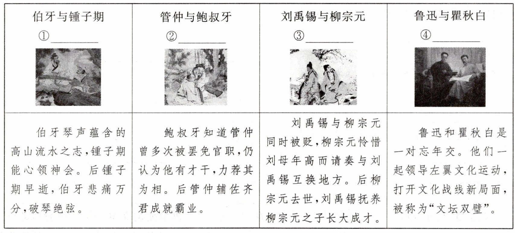3. 小华搜集了下面的图片和故事,请你根据内容,选择恰当的主题词填入横线处,从而感受交友之道。