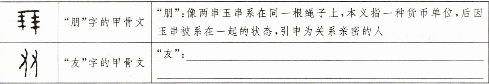 )2. 小文查找了"朋友"二字的甲骨文,请你仿照表格中"朋"字的字源解说,对"友"字做字源解说。