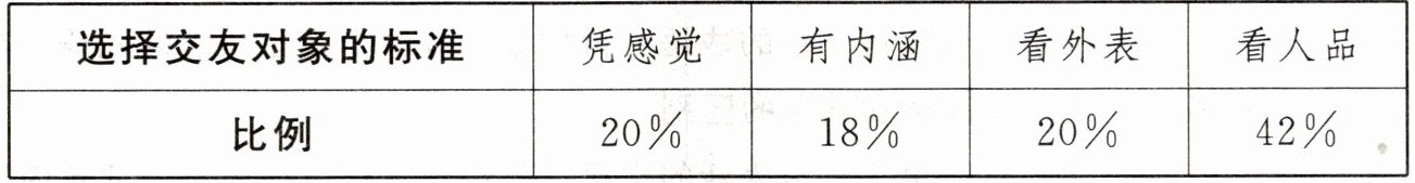 【示例】近半数中学生交友时看重对方人品。(或中学生交友时看对方是否有内涵的人数占比最少。)