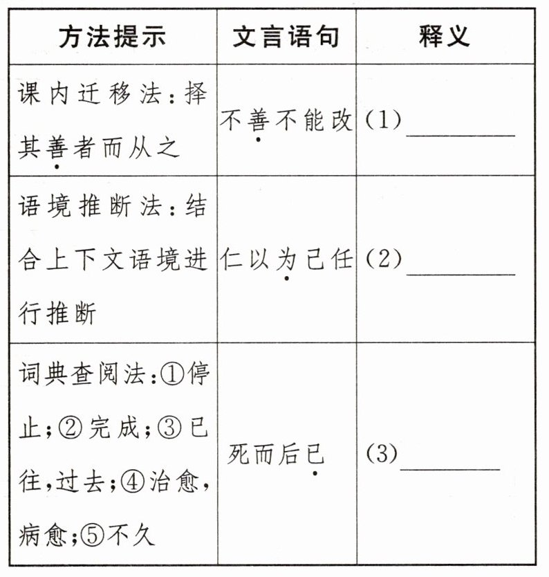 10. 请根据表格中的方法提示,解释下列文言语句中加点的词。(3分)