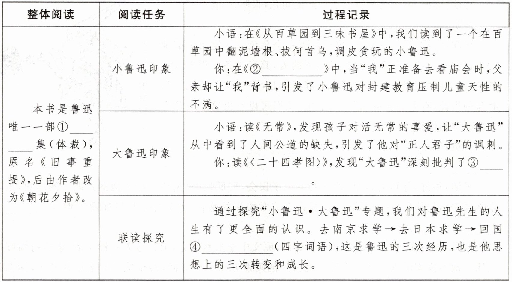 1. 小语按照“小鲁迅·大鲁迅”专题来梳理《朝花夕拾》,在经典作品中感悟人生的真谛,并邀请你一起完成任务。