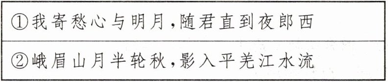 5. C 【解析】C项,本诗五个地名连用造成空间迅速转换之感,而非“造成时间迅速转换之感”。 6. 【示例】诗句②。该诗句描绘了半轮明月高高悬挂在峨眉山前,月影倒映在澄澈的水面上,仿佛在随着江水流动的画面。图中恰有一轮弯月高悬于山前,两岸山峦高峻,流淌的江面上摇曳着月影。因此诗句②更适合作为图片的配诗。