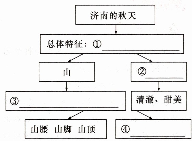 10.①古朴、安静、秀美 ②水 ③颜色、方向、高矮不同 ④绿藻、鸭子 11.“自己”“甜美”重读(1分),读出轻柔、宠溺的语气(1分),表达出作者对济南秋日绿藻(水)的喜爱与赞美之情(1分)。 12.运用拟人的修辞手法(1分),赋予绿藻以人的情态,“心事”“吻着”“香梦”生动形象地写出了绿藻的调皮、可爱(1分),也从侧面表现了水的清澈(1分)。 13.《济南的秋天》写水藻是为了从侧面突出秋水澄清、甜美的特点,表现出济南秋天的诗境。(2分)《济南的冬天》写水藻是为了衬托冬水绿的特点和济南冬天温晴的特点,表现出济南冬天的无限生机和冬天孕育着的朦胧春意。(2分)