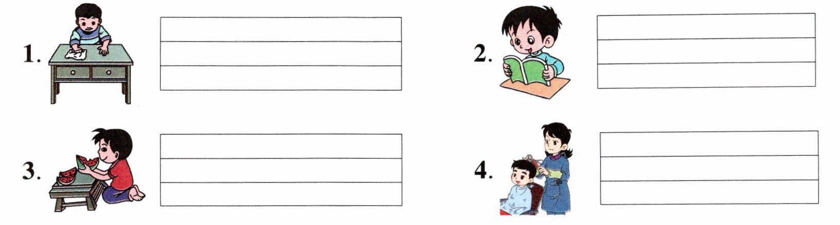 1. cā zhuō zi 2. dú shū 3. chī xī guā 4. lǐ fà