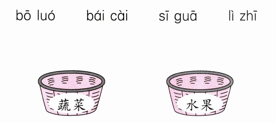 蔬菜:bái cài sī guā 水果:bō luó lì zhī