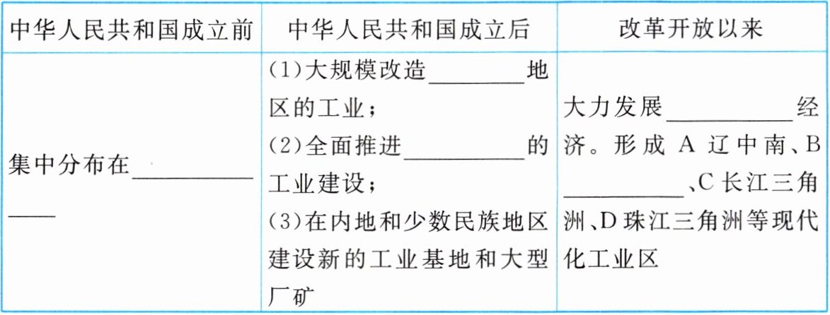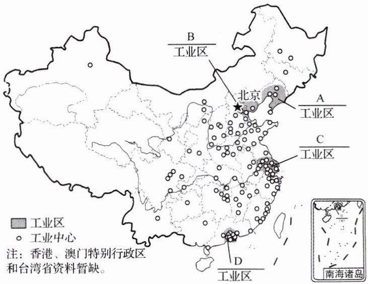 由于您未提供具体的题目问题(如图中A、B、C、D工业区的名称等),无法直接给出答案。请补充具体问题,例如“图中A工业区的名称是?”“我国工业分布的基本格局是?”等,以便按照湘教版八年级上册“中国的工业”相关内容规范解答。