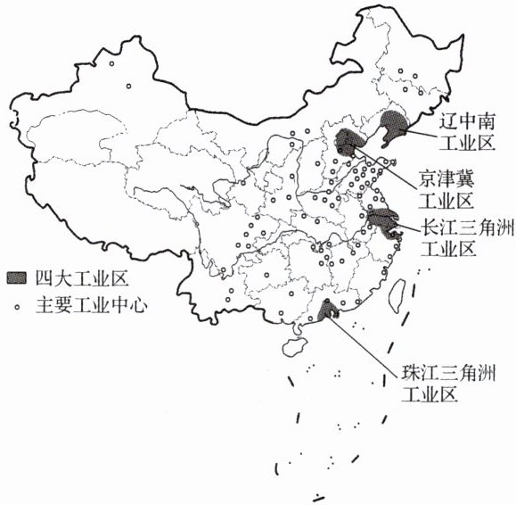 读我国主要工业区和工业中心分布示意图,完成1~2题。