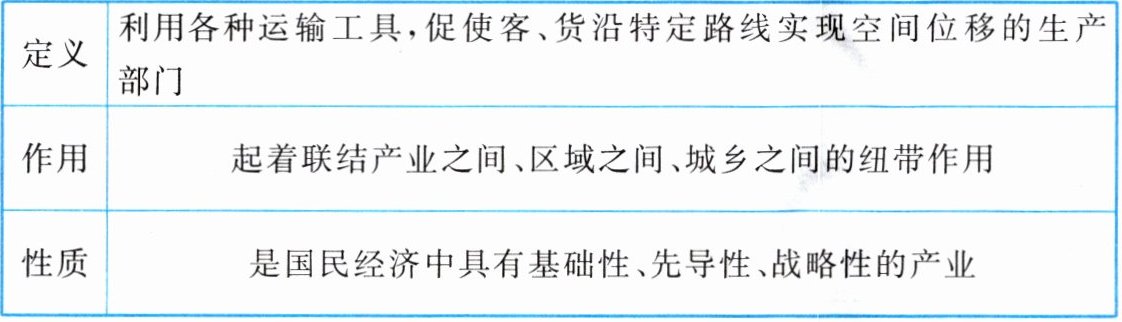 (定义:利用各种运输工具,促使客、货沿特定路线实现空间位移的生产部门;作用:起着联结产业之间、区域之间、城乡之间的纽带作用;性质:是国民经济中具有基础性、先导性、战略性的产业)