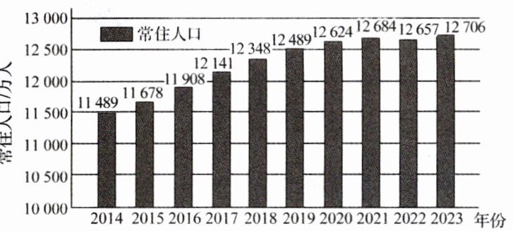 (2024.广东学业考)2023年,广东省常住人口比上年增加49万人,连续多年保持全国第一位。读广东省2014-2023年常住人口数量统计图,完成7~9题。