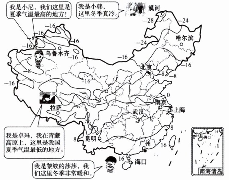 思考1:小韩位于漠河附近,纬度高,冬季太阳高度小且白昼时间短,邻近冬季风的源地,气温低;莎莎位于海南省,纬度低,冬季太阳高度大且白昼时间比漠河长,气温高。 思考2:青藏高原平均海拔在4000米以上,海拔越高,气温越低,受地势的影响,青藏高原成为我国夏季气温最低的地方。 思考3:①距海远,海洋水汽难以到达,空气干燥,云层少,太阳辐射强。②盆地地形,不易散热。③盆地内沙漠广布,吸热快。