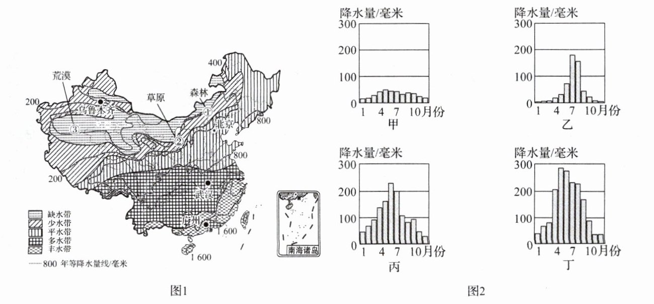 (2025.昭通期中)读我国径流带分布图(图1)和四个城市降水量柱状图(图2),完成4~6题。