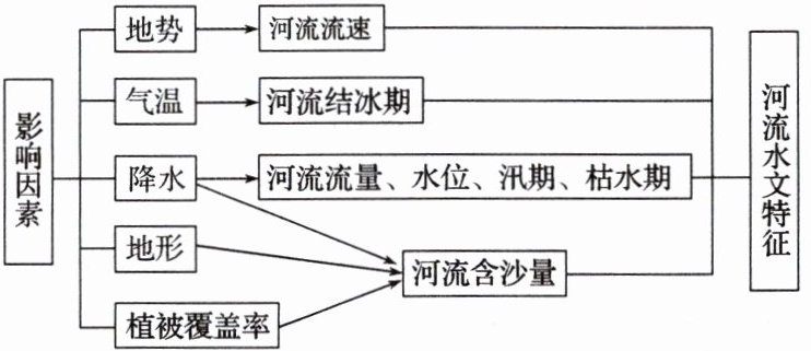 [思考1] 气温:秦岭—淮河线以北地区最冷月平均气温低于0℃,河流有结冰现象;秦岭—淮河线以南地区最冷月平均气温高于0℃,河流无结冰现象。 降水:秦岭—淮河线以南地区降水量大,雨季长,河流流量大,汛期长;秦岭—淮河线以北地区降水量小,雨季短,河流流量小,汛期短。 [思考2] 地势西高东低,使大多数河流自西向东注入太平洋;地势呈阶梯状分布,阶梯交界处落差大,水能丰富。 [思考3] 植被覆盖多的地区河流含沙量小,覆盖少的地区河流含沙量大。