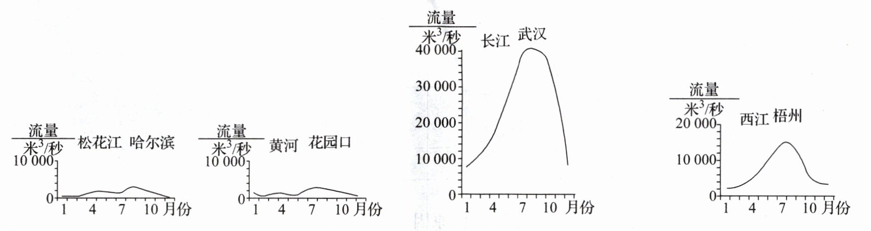 读我国东部主要河流流量的年变化曲线图,完成3~4题。