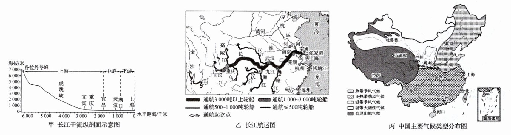 水运:读图乙、图丙,说明长江为什么有“黄金水道”之称。