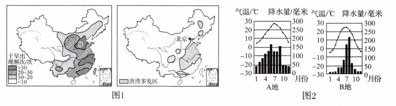 独特的自然地理环境和季风气候条件使得我国成为世界上旱涝灾害最为频繁和严重的国家之一,旱涝灾害的频繁发生及持续积累给我国社会发展和生态环境造成严重破坏。图1为我国干旱灾害发生频次分布图和我国洪涝灾害分布图,图2为A、B两地的气候资料图。读图,回答下列问题。