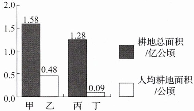 中国陆地面积略多于美国,但耕地总面积少于美国。读两国耕地情况对比图,完成6~7题。