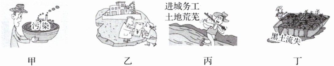 )A.甲一耕地污染 B.乙一弃耕增多 C.丙一耕地退化 D.丁-乱占耕地
