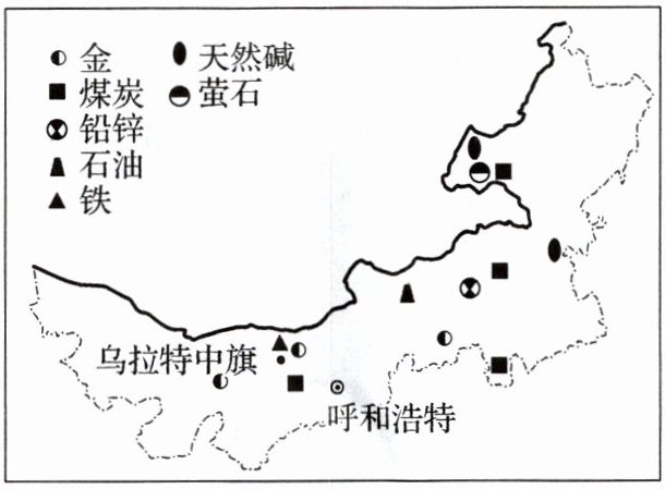 种矿产的保有资源量居全国第一位。下图为我国内蒙古矿产资源分布图。读图,回答下列问题。