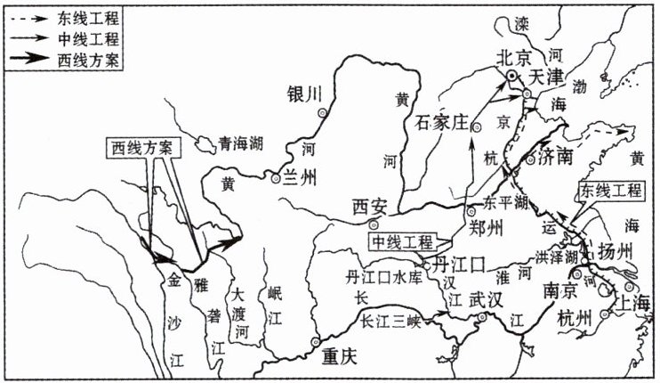 )A.中线途经半干旱地区 B.东线由丹江口水库引水