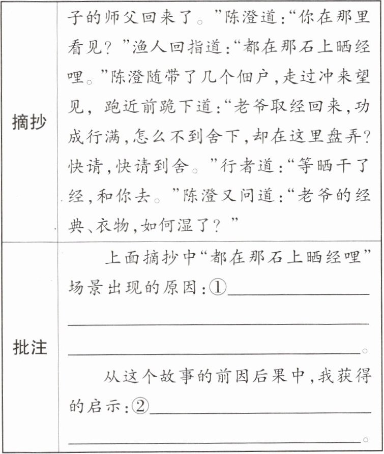 ①唐僧师徒四人取经回来的途中,通天河中的老鼋驮师徒四人渡河。因唐僧忘记了当年老鼋托自己问佛祖寿年之事,老鼋一怒之下,将师徒四人翻入河中,故此打湿了经典、衣物(意思对即可)②示例:不要轻易许诺,答应别人的事情就一定要做到,不可失信于人 [解析]本题考查名著情节及阅读启示。《西游记》第九十九回情节中,唐僧因忘记向如来打听老鼋所托付的事情,老鼋一怒之下将师徒四人翻入河中,据此谈原因。围绕“诚信”谈启示即可。
