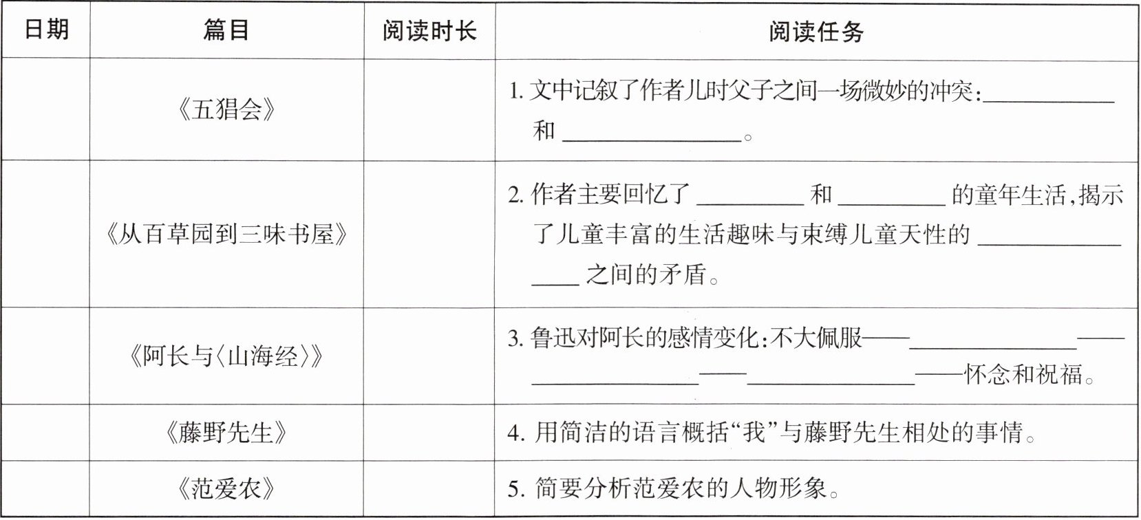 1. 我对五猖会的热切期盼 父亲强迫我背书 2. 百草园 三味书屋 封建教育制度 3. 不耐烦 产生怨恨 产生新的敬意 4. 添改讲义、纠正解剖图、关心解剖实习、了解中国女人裹脚 5. 范爱农是一位正直倔强、愤世嫉俗又孤独悲凉的爱国知识分子,他不满黑暗社会,却又无力反抗,最终被社会吞噬。