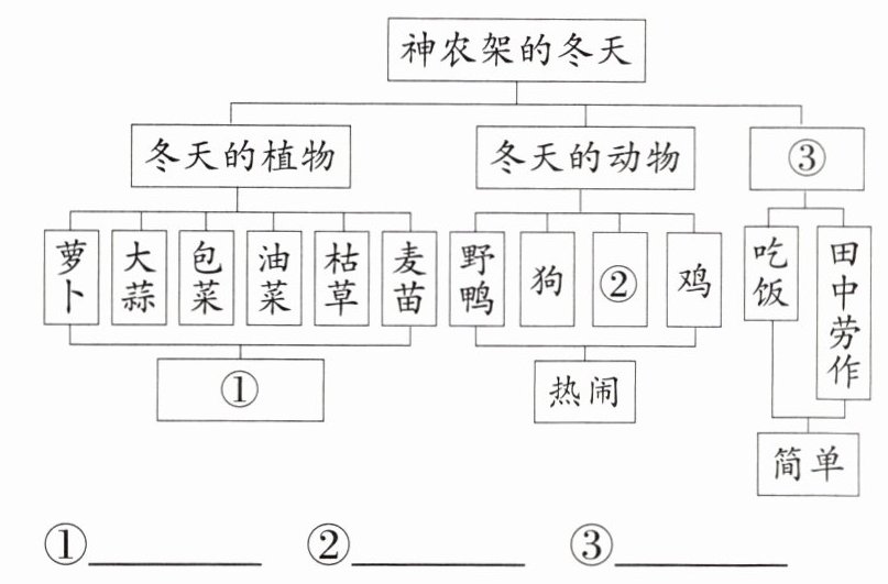 ①顽强(生机勃勃) ②水鸟(或喜鹊、野兔) ③冬天的人(人的活动)
