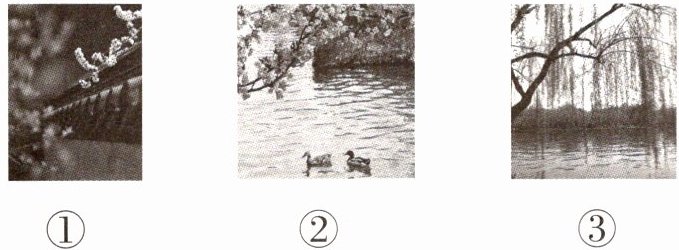 [解析]本题考查赏析图片和诗句积累。图①有一枝红杏伸出墙外,可以想到叶绍翁《游园不值》中的诗句"春色满园关不住,一枝红杏出墙来";图②上方有几枝桃花,下面的湖面上有两只鸭子,可以想到苏轼《惠崇春江晚景》中的诗句"竹外桃花三两枝,春江水暖鸭先知";图③有一棵柳树,轻柔的柳枝垂下来,可以想到贺知章《咏柳》中的诗句"碧玉妆成一树高,万条垂下绿丝绦"。