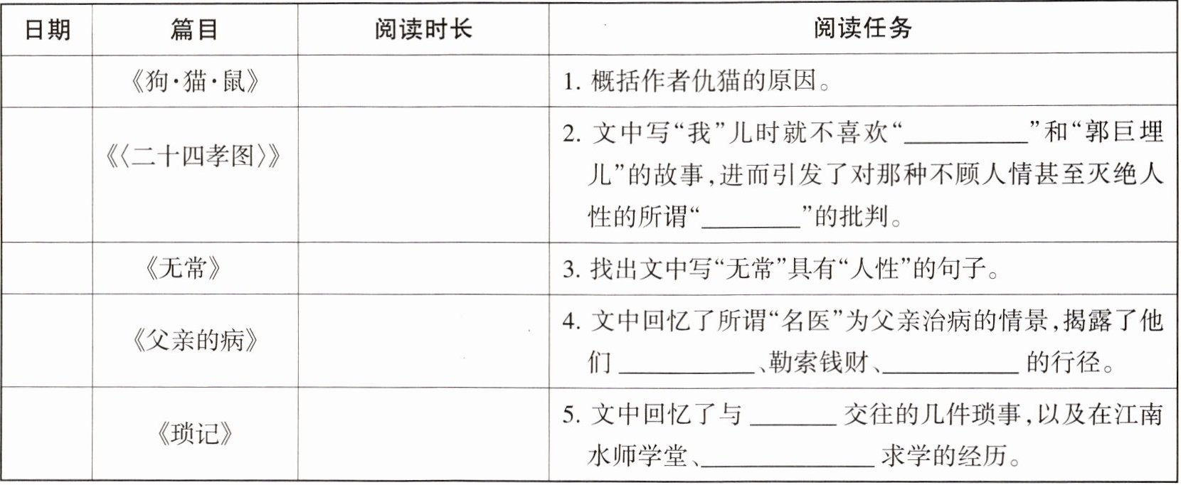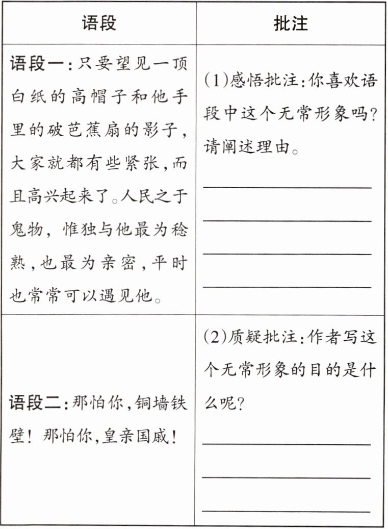 2. 中考新考向批注式阅读方法 下面是某同学阅读《无常》所做的批注卡片,请你帮他补充完整。