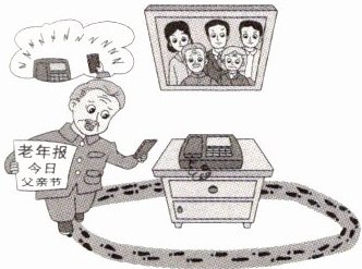 这是一幅名为《等待》的漫画,画面中有一位老人,一手拿着报纸,报纸上有“老年报 今日父亲节”的字样,一手拿着手机。老人一边盯着手机看,一边围绕着放有电话的桌子转,脑中想着电话和手机的铃声。墙上贴有老人和老伴及三个子女的全家福。这幅漫画揭示的是现实生活中子女疏忽了对父母的关心与问候的现象。