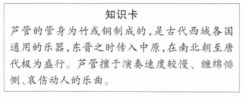 (2)吹奏芦管,是速度较慢、缠绵悱恻、哀伤动人的乐曲,易引发思乡情绪,本诗的自然环境与芦管曲调融为一体,表达了诗中戍边将士无限的思乡之情。因此不能写成“黑管”。