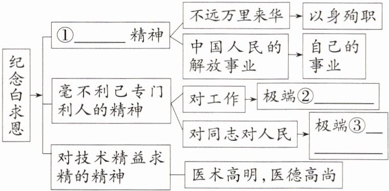 [解析]本题考查理清文章思路。第①空,结合第 1 段“一个外国人,毫无利己的动机,把中国人民的解放事业当作他自己的事业,这是什么精神?这是国际主义的精神”可提取出答案:国际主义;第②空,结合第 2 段首句“白求恩同志毫不利己专门利人的精神,表现在他对工作的极端的负责任”可提取出答案:负责。第③空,结合第 2 段“对同志对人民的极端的热忱”可提取出答案:热忱。