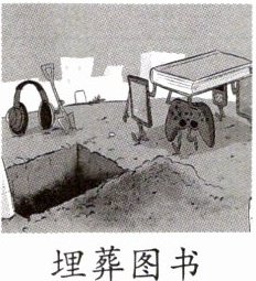 内容:耳机拿着铁锹立在挖好的坑旁边,游戏手柄、手机、平板电脑等电子产品抬着一本纸质书朝大坑走去。寓意:电子产品盛行,将把纸质书籍推向“坟墓”,警示我们不能沉迷电子产品,而要注重纸质书籍的阅读。