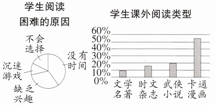 (2)示例:调查结论:①没有时间是本校学生阅读困难的主要原因(或本校近半数的学生是因为时间不够而感到阅读困难);②本校学生课外阅读类型中卡通漫画占大多数(或超过半数的学生课外阅读类型是卡通漫画,阅读文学名著的比例最低)。阅读建议:①合理规划阅读时间,制订计划;②不仅要增加课外阅读量,还要广泛阅读各类型的优秀读物(提高文学名著的阅读比例)。